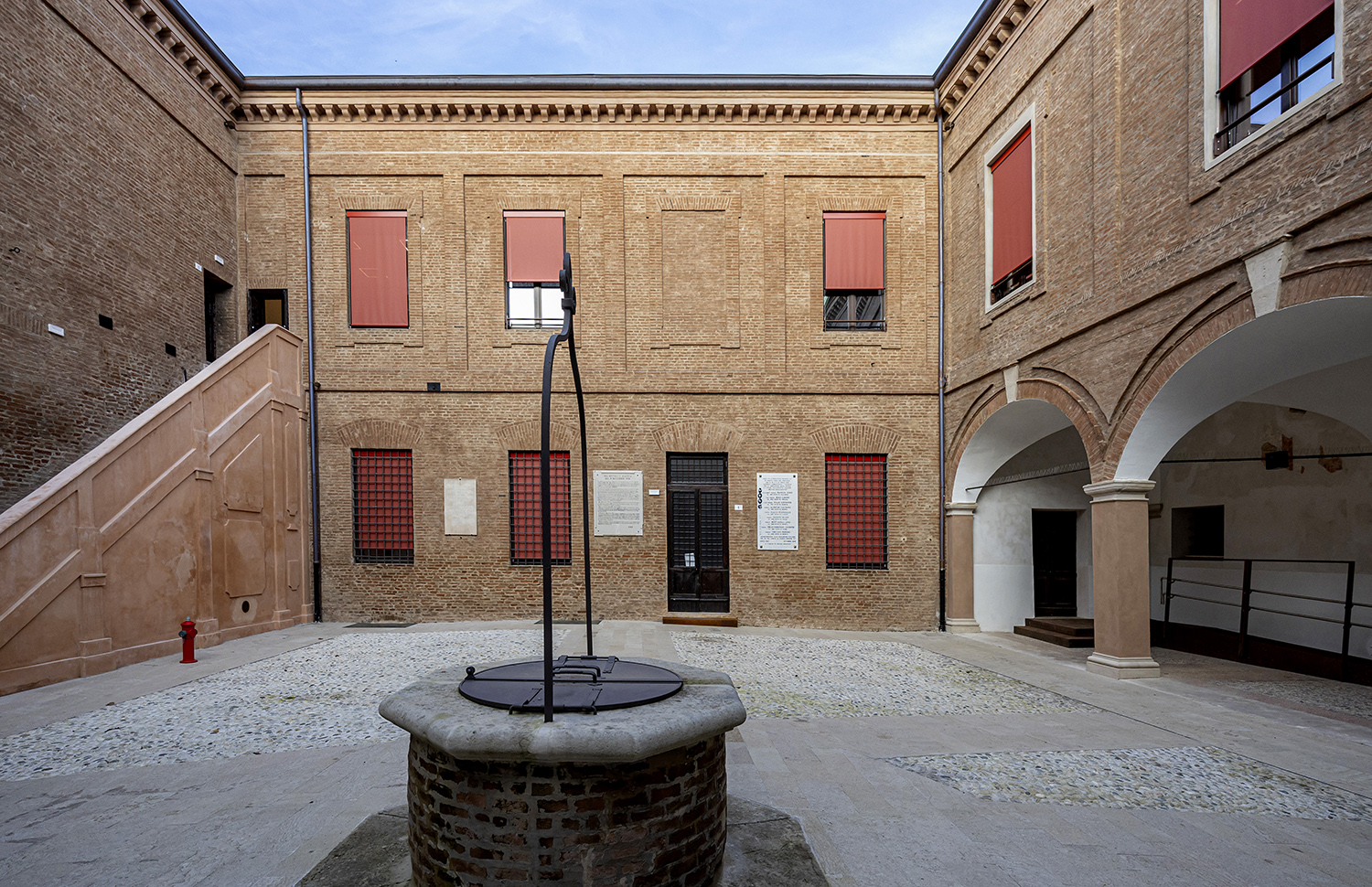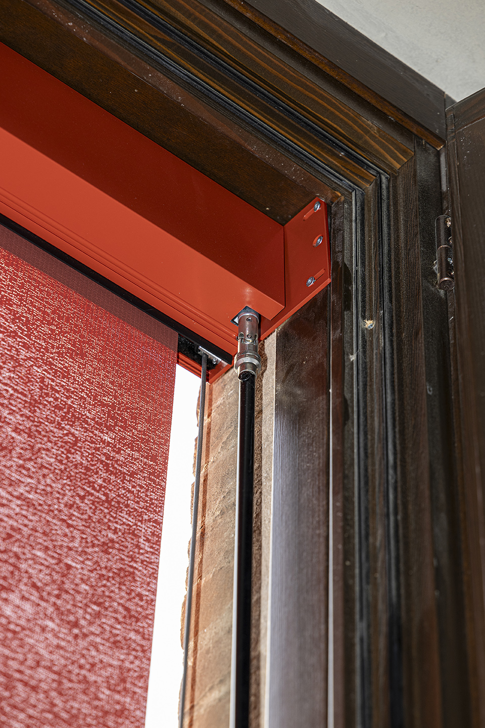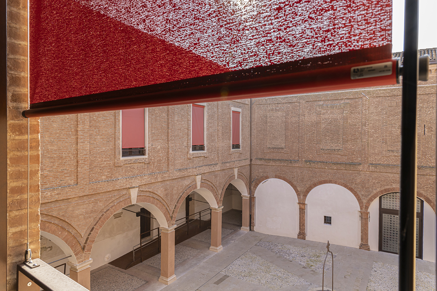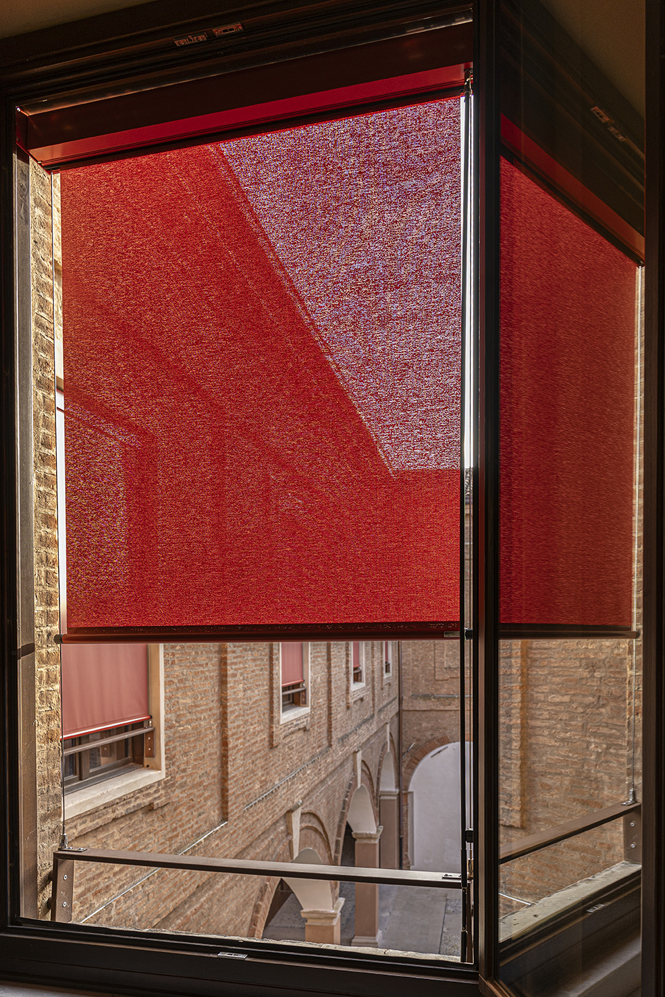 Le schermature solari originarie, tendaggi a pacchetto alla “ferrarese” di ispirazione tradizionale, sono state reinterpretate utilizzando tecnologie avanzate e materiali innovativi. I modelli di tende installate, quali L1 504, L1 505, L1 511 e L1 512, sono dotati di cassonetto C91 e C104 in alluminio verniciato RAL 3016 rosso amaranto, combinato con il tessuto Soltis 92 Perform tonalità rosso mattone – cod. 38180. Ignifugo e con un fattore di apertura del 4%, si combina perfettamente con la struttura della tenda garantendo una soluzione tecnologica, durevole e resistente agli agenti atmosferici con ottime prestazioni energetiche per ridurre l’impatto estetico e i costi di manutenzione.