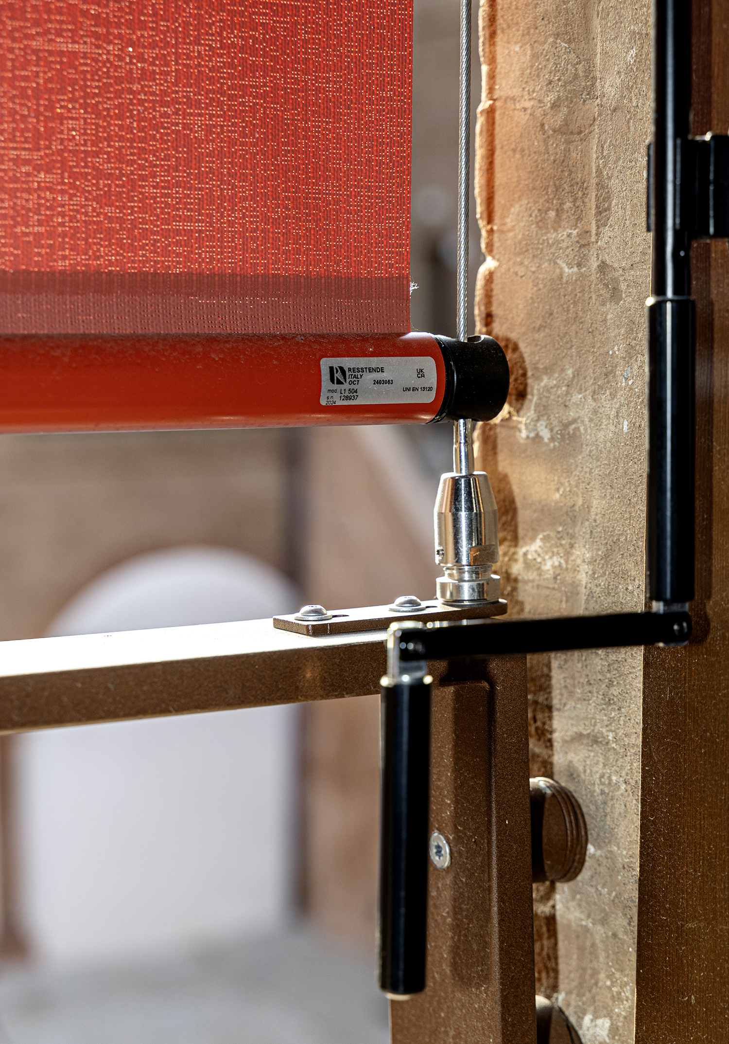 Un’ulteriore peculiarità delle tende a rullo installate è il loro sistema di fissaggio, che varia a seconda della posizione: alcune tende sono fissate direttamente a pavimento, altre a una balaustra tramite una ringhiera dotata di una piastra personalizzata su cui è ancorato il barilotto tendicavo. Questa soluzione è stata progettata appositamente per rispondere alle esigenze estetiche e strutturali del castello garantendo stabilità e tensionamento del telo.