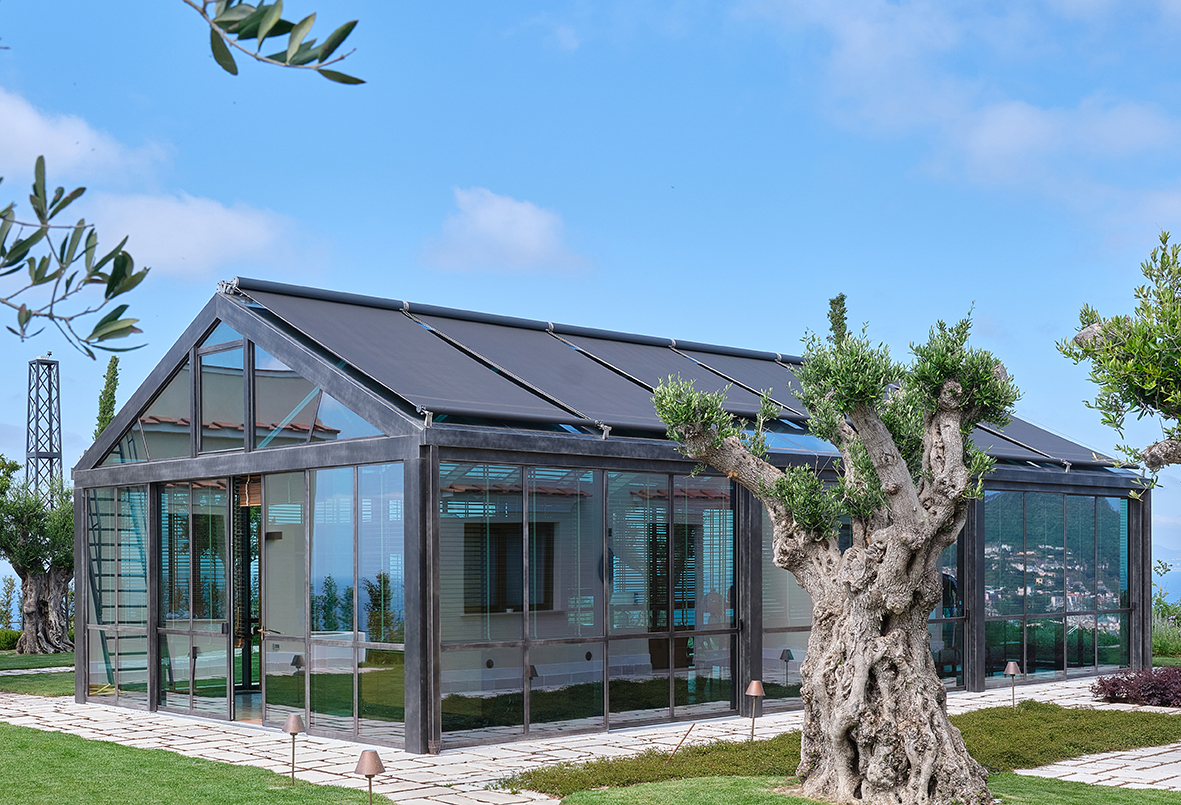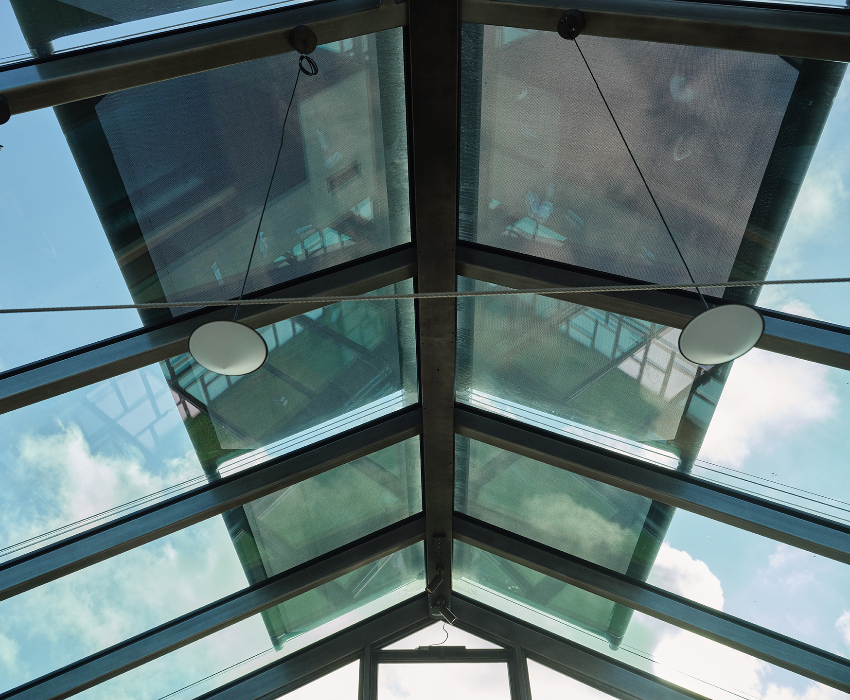 Resstende ha fornito la soluzione ideale per schermare questo spazio, installando 12 tende a rullo inclinate esterne motorizzate modello DALLAS TKO 135, con struttura in colore nero e tessuto Sunscreen Satiné 5500 nero (cod. 33006).