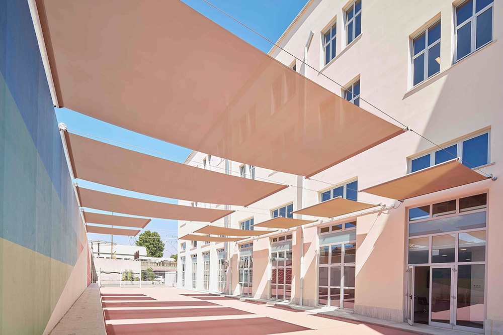 Nel particolare contesto della NABA, nel quale la visione del futuro si fa presente e si concretizza nelle mani degli studenti, è stato necessario creare una schermatura solare adatta al lungo corridoio che conduce all’ingresso per creare una zona fresca e ombreggiata. Dieci sono in totale i sistemi a rullo orizzontali installati, cinque per ogni lato del corridoio. La schermatura copre una larghezza complessiva di oltre 11 metri per una profondità che supera i 16 m.