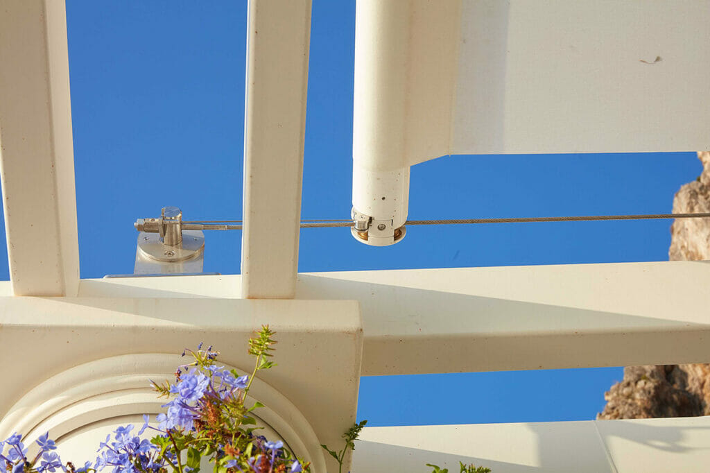 Come indicato, il Traction Kit è un dispositivo di trazione forzata di nuova concezione che contrasta efficacemente l’azione del vento grazie all’energia controllata dai pistoni a gas alloggiati nel fondale tondo. In tal modo, il sistema garantisce una maggiore stabilità alla tenda montata in ambiente esterno, rivelandosi una soluzione molto efficace per medie e grandi luci.